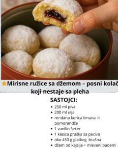 POSNE VANILICE Mekane, tope se u ustima, savršene za slavu i post. Sastojci: Za testo: 250 g posnog margarina (sobna temperatura) 120 g šećera u prahu 1 vanilin šećer 3 kašike soka od limuna ili 3 kašike mineralne vode 450–500 g brašna (postepeno dodavati) Za fil: 200 g finog džema od kajsije (najbolji za vanilice) … Read more