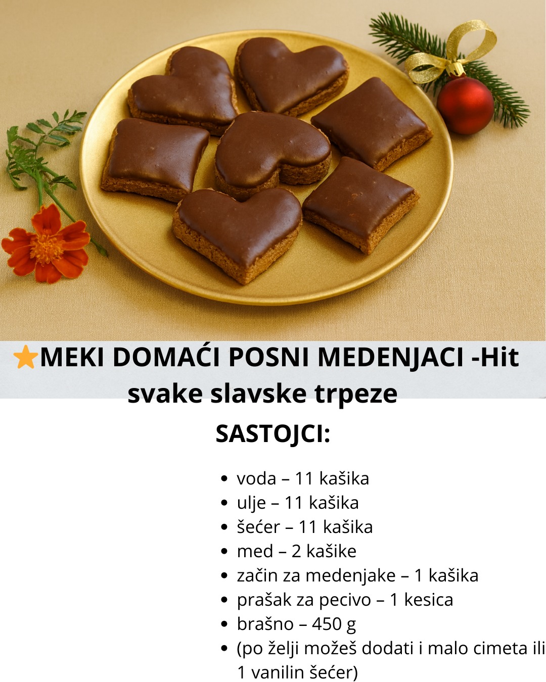 POSNI MEDENJACI Sastojci Suvi sastojci: 300 g brašna 100 g šećera 1 kašičica sode bikarbone 1 kašičica cimeta ½ kašičice mlevenog đumbira 1 kašičica kakaa (opciono – za boju) Prstohvat soli Mokri sastojci: 100 ml ulja 120 ml tople vode 4 kašike meda ili posnog zaslađivača (agavin sirup, javorov sirup) 1 kašičica ekstrakta vanile Za … Read more